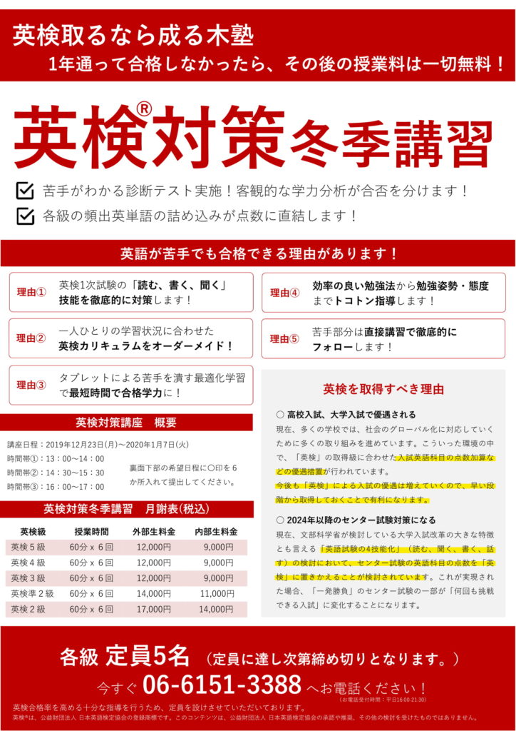 2019.11.19 お知らせ 【英検二次試験】合否発表 本日、英検二次試験の結果発表がありました。 二次対策クラスを受講された塾生の合格率は100%でした。 短い時間で終わってしまう二次試験は、いかに心の準備をしておくかという事がキーになります。 次回、第三回試験が1月26日に予定されております。 冬季講習(緑丘本校のみ)や対策授業の空き席もまだございますので、お気軽にお問合せ下さい。 英検取るなら成る木塾