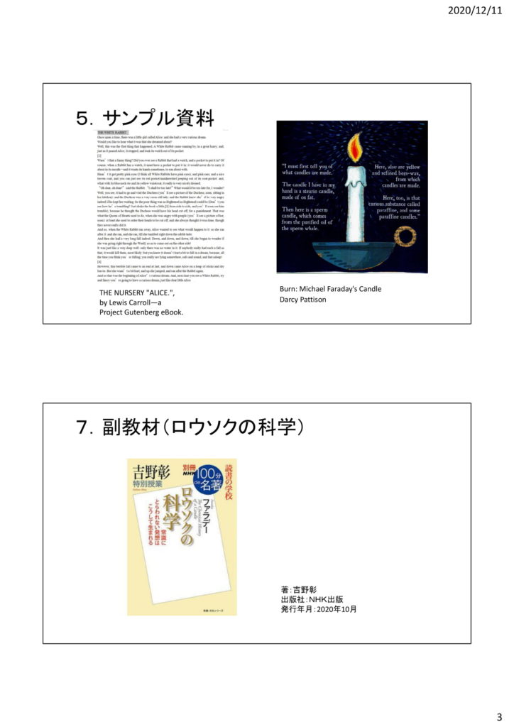 17:30~18:15:①THE CHEMICAL HISTORY OF CANDLE(ロウソクの化学)※英語絵本を使います。