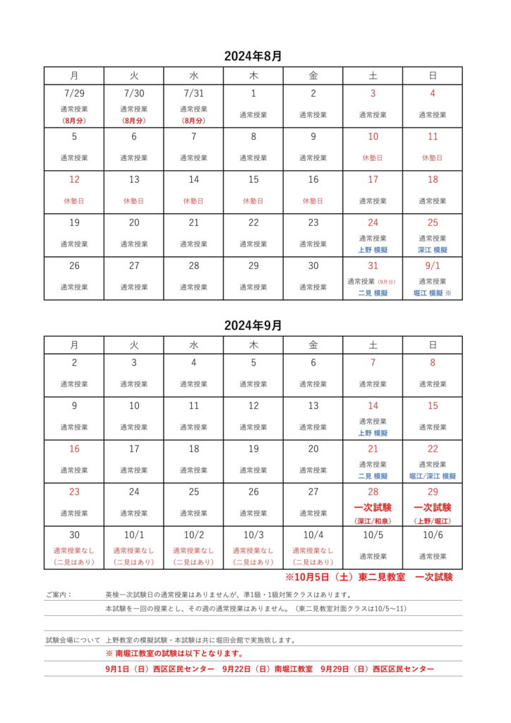 【カレンダー】2024年度第2回英検に向けて
